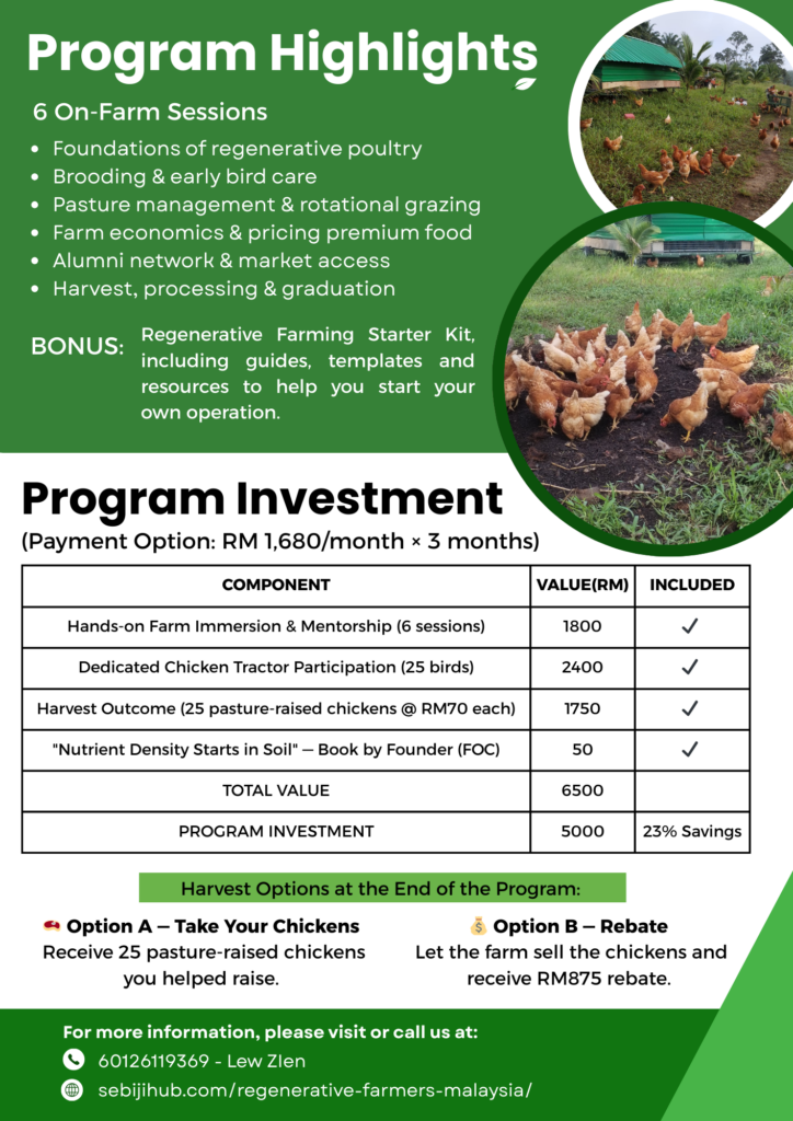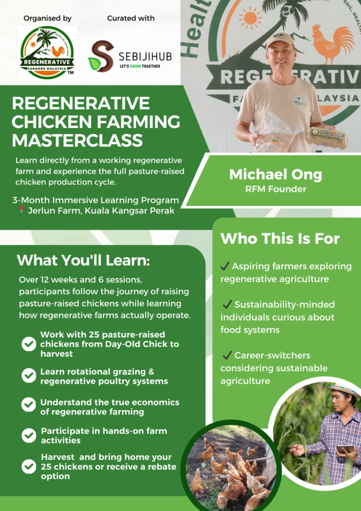 In 2023, at age 50, Michael started Regenerative Farmers Malaysia with six chickens and RM 300. Eighteen months later, RFM operates 1,000 birds across 7 acres of owned land in Kuala Kangsar — a working proof-of-concept that profitable farming and land regeneration aren’t opposites.